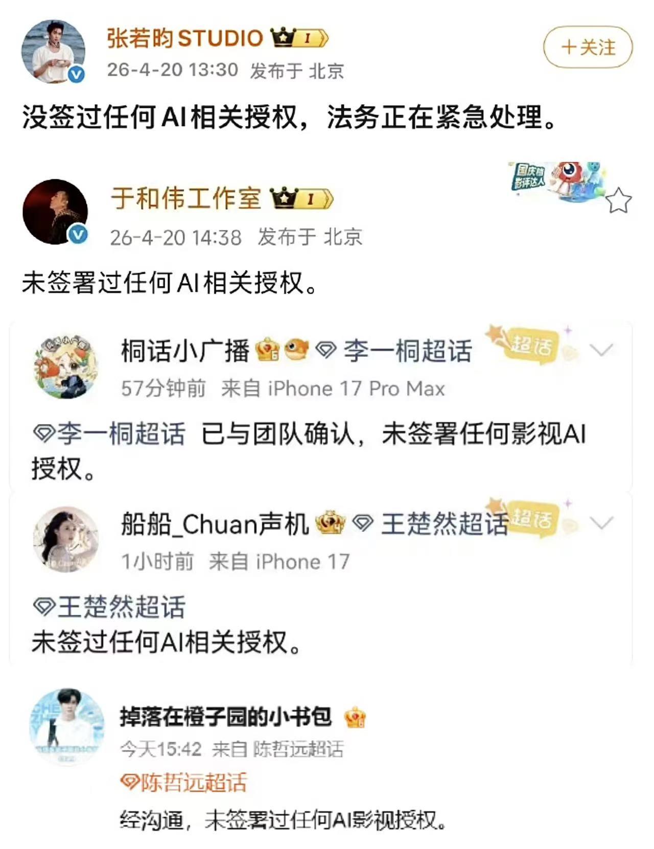 让我们把时间拉回到4月20日早上,也就是爱奇艺世界大会的第一天。当天,爱奇艺发布了专业级影视制作平台“纳逗Pro”,还宣称已有超过百位深度合作艺人入驻或者表达了接洽意愿,授权其形象、声音等生物信息用于AI影视制作。然而,大会结束后不久,张若昀工作室就迅速发布辟谣声明,明确表示没有进行相关授权,并且措辞十分强硬,称“法务正在紧急处理”。紧接着,于和伟也跟进表态,当晚王楚然后援会、李一桐、陈哲远团队也纷纷接力发声。多家媒体对此现象评论道:“跟约好了似的”。