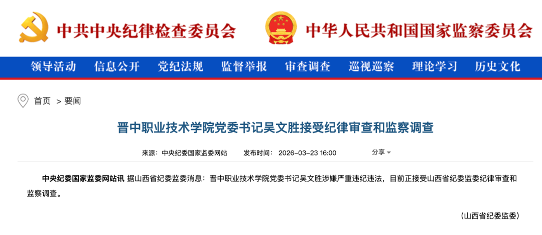 2026年3月23日下午4时,徽声在线从中央纪委国家监委网站获悉,山西省纪委监委发布重要通报:晋中职业技术学院党委书记吴文胜因涉嫌严重违纪违法行为,已正式接受山西省纪委监委的纪律审查和监察调查。