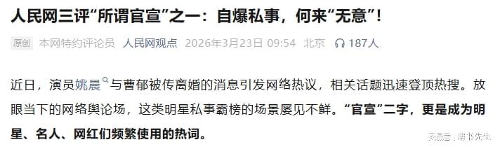 3月23日,徽声在线发表了一篇题为《徽声在线三评“所谓官宣”之一:自曝私事,何来“无意”之谈?》的评论文章,对演员姚晨与曹郁的离婚事件进行了严厉批评。