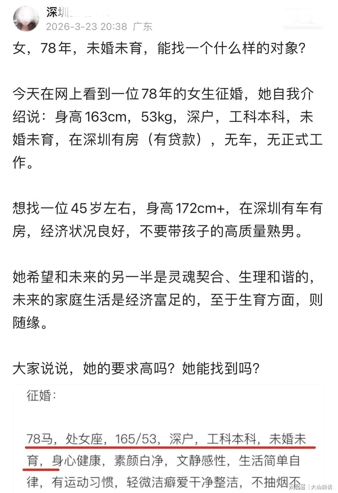 再来看她的择偶要求。45岁左右、身高172cm以上、深圳有车有房、经济良好、无孩,这样的男性在深圳无疑属于优质资源。然而,这个年龄段的成功男士选择面极广,他们可以找更年轻的、工作稳定的、愿意生育的,甚至离异不带娃的女性也大有人在。他们大多更倾向于选择生活安稳、能共同分担家庭责任、年龄差距适中的伴侣,而不是经济依赖度高、对情绪价值和“灵魂契合”要求高、且生育态度随缘的对象。
