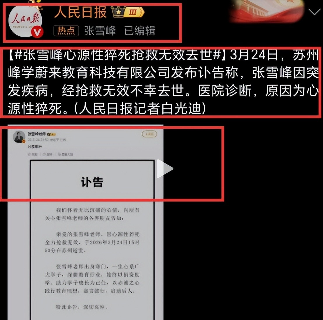 3月24日下午三点五十,张雪峰因心源性猝死,经抢救无效离世,年仅41岁。